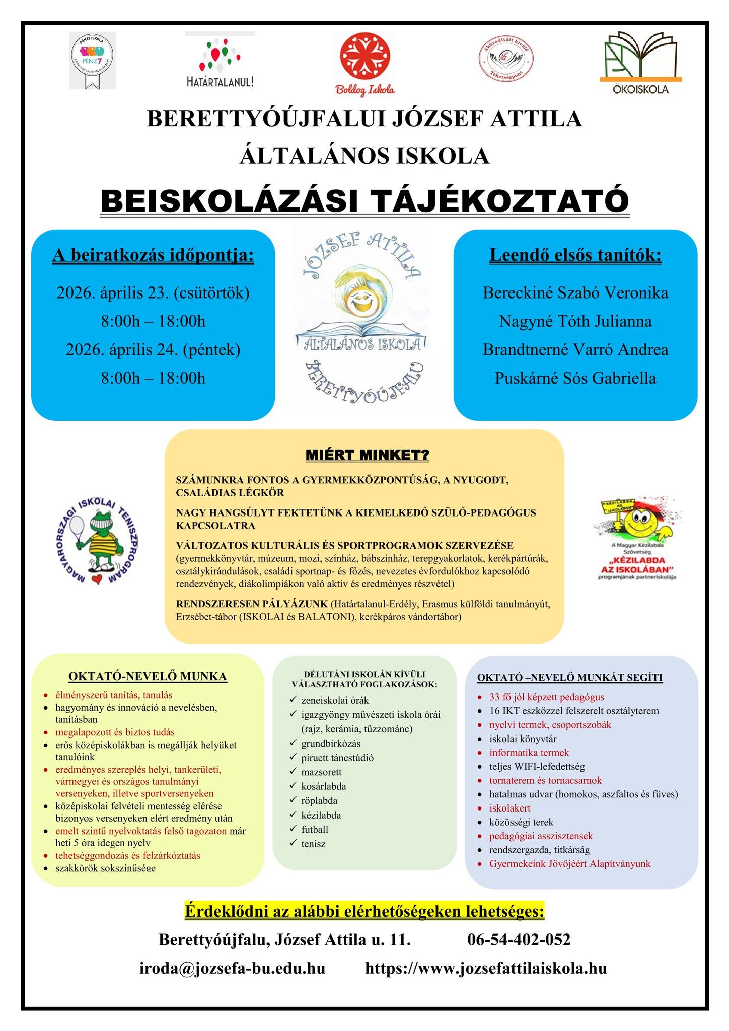 A személyes úton történő beiratkozás könnyebb és gyorsabb lesz, ha előtte online feltöltik (www.jozsefattilaiskola.hu honlapon található szülői tájékoztató szerint) a beiratkozáshoz szükséges dokumentumokat KRÉTA rendszerben vagy Ügyfélkapun keresztül, mely 2026. március 31-től lesz elérhető.