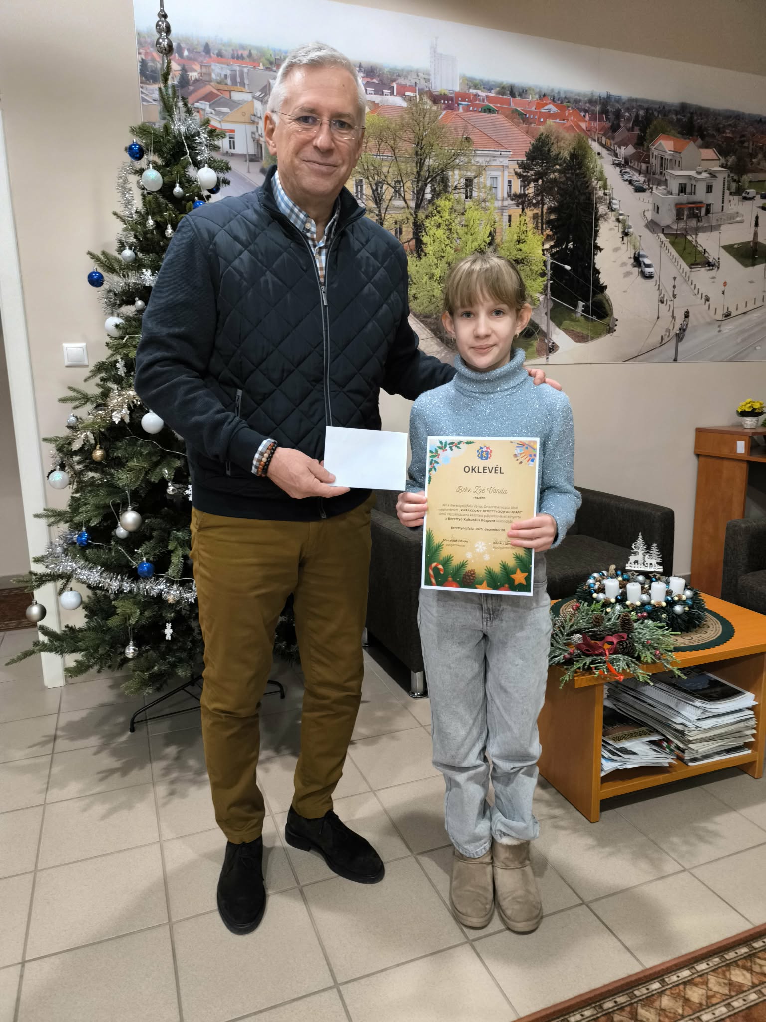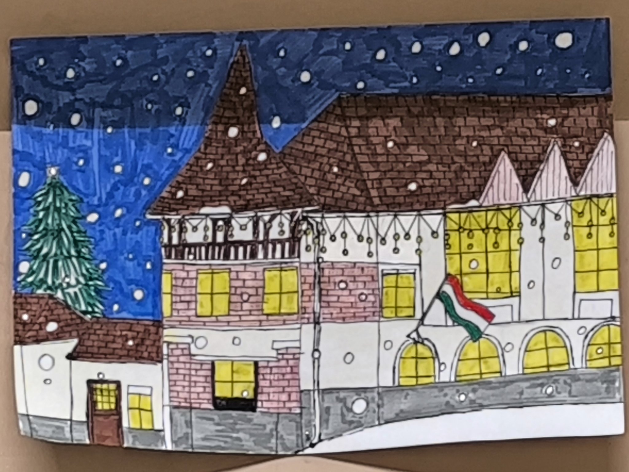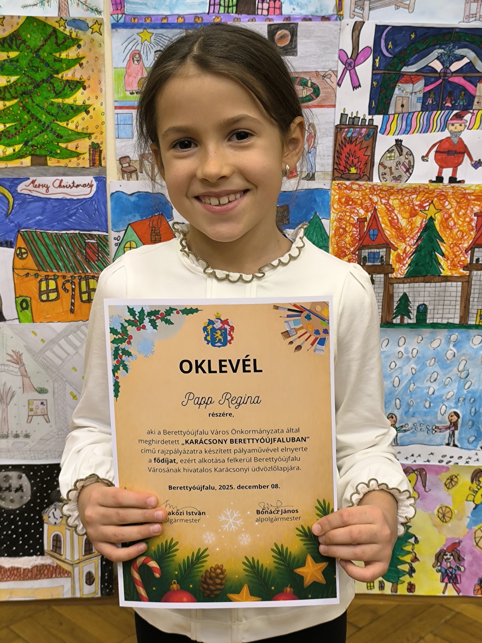 A zsűri döntése alapján Papp Regina, a 3.b osztály tanulója nyerte el az első helyet, így az ő rajza díszíti Berettyóújfalu idei karácsonyi képeslapját.